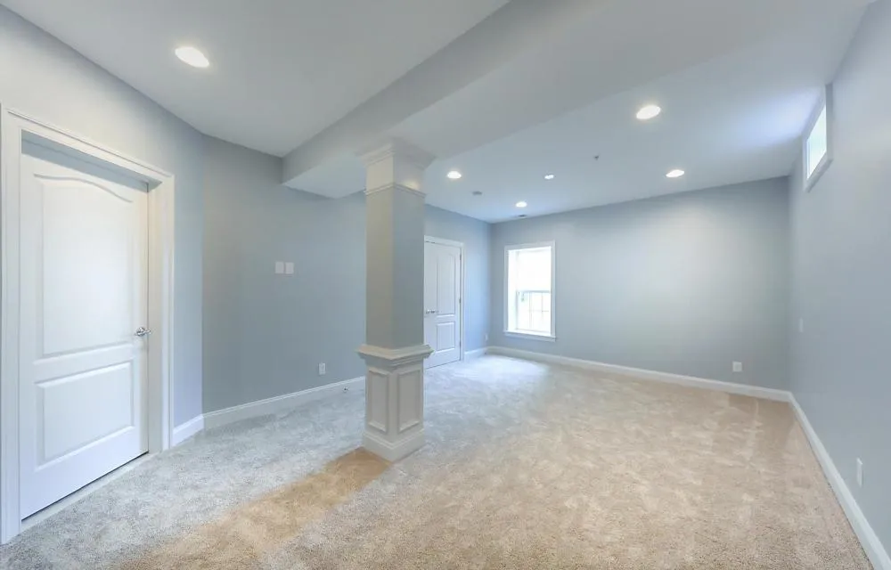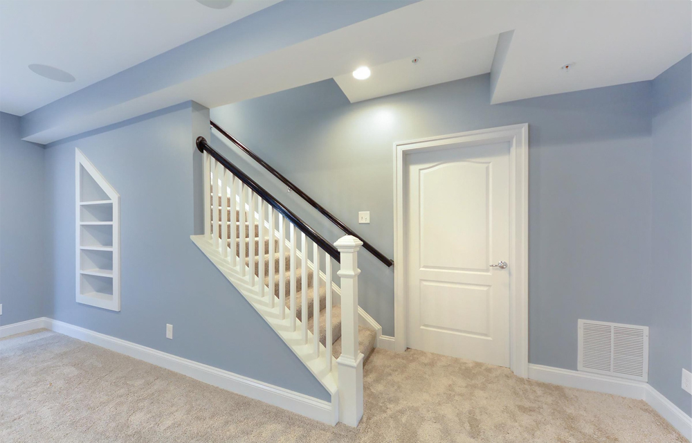 This basement renovation project highlights both functionality and elegance. The design features plush carpeting for comfort and sound insulation, while the soft, neutral tones create a warm and inviting atmosphere. Custom-built shelving and refined column details enhance the aesthetic appeal, making the space ideal for a family room or entertainment area. The clean, modern staircase provides a seamless transition between floors, adding to the overall sophistication of the design.