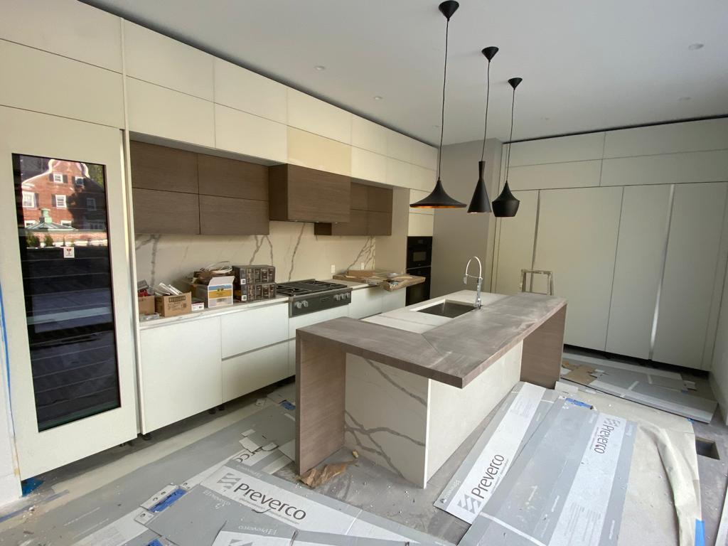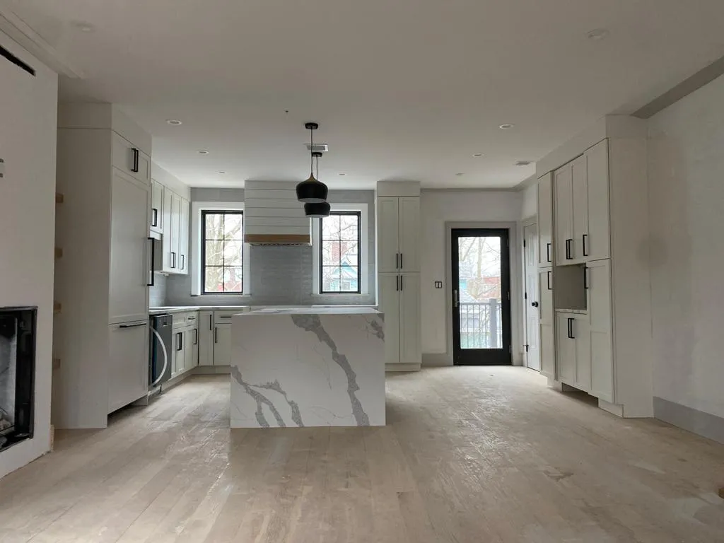 This modern kitchen design emphasizes clean lines and simplicity. The centerpiece is a stunning marble island with bold veining that adds a touch of luxury. The sleek cabinetry, large windows, and soft-toned flooring work together to create a bright and airy space. This kitchen is perfect for anyone looking for a contemporary space that combines style with functionality.