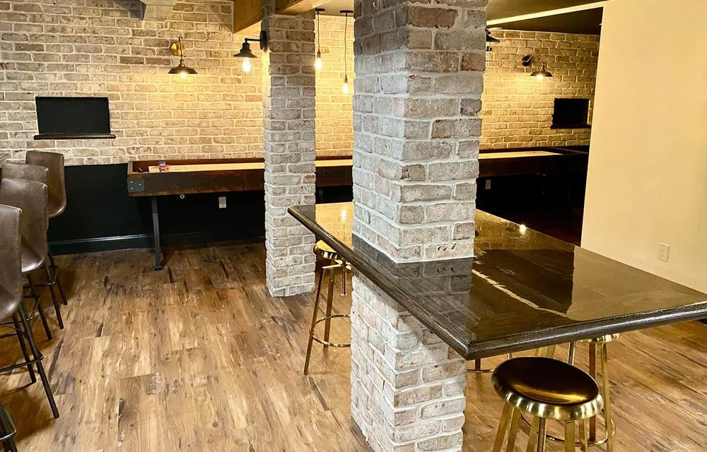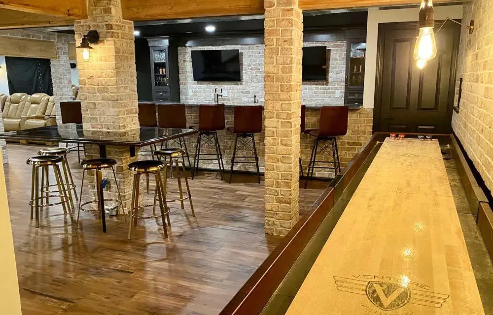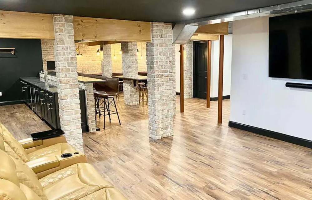 The "Rustic Retreat Basement Remodel" project transforms a standard basement into a luxurious, multifunctional entertainment space. Exposed brick pillars and walls give the space a warm, rustic charm, perfectly complemented by the rich wood tones of the flooring and ceiling beams. The design incorporates a custom-built bar area with a polished stone countertop and ample seating, making it the perfect spot for hosting gatherings or enjoying a casual drink.