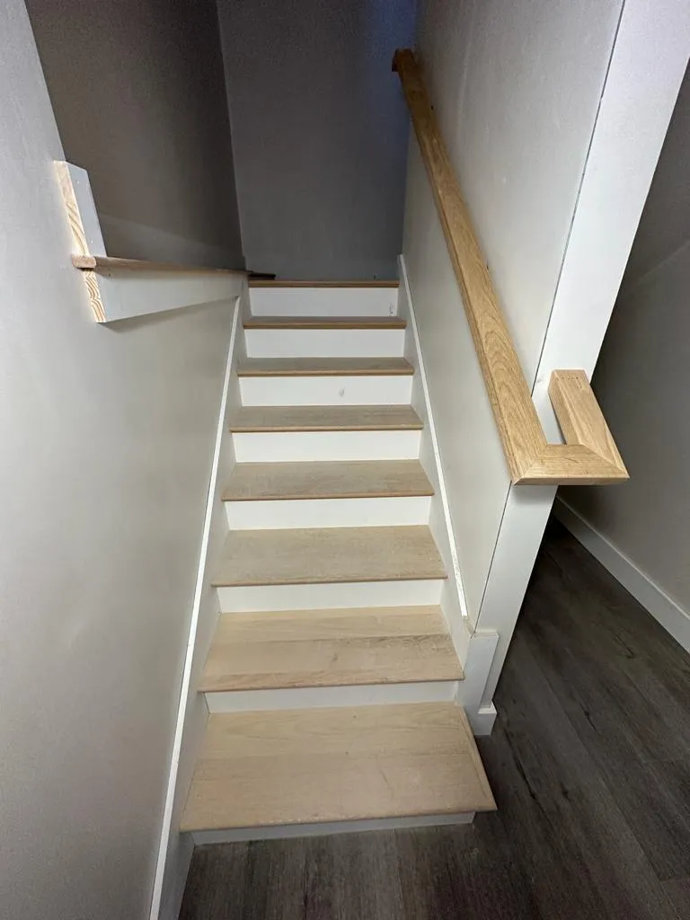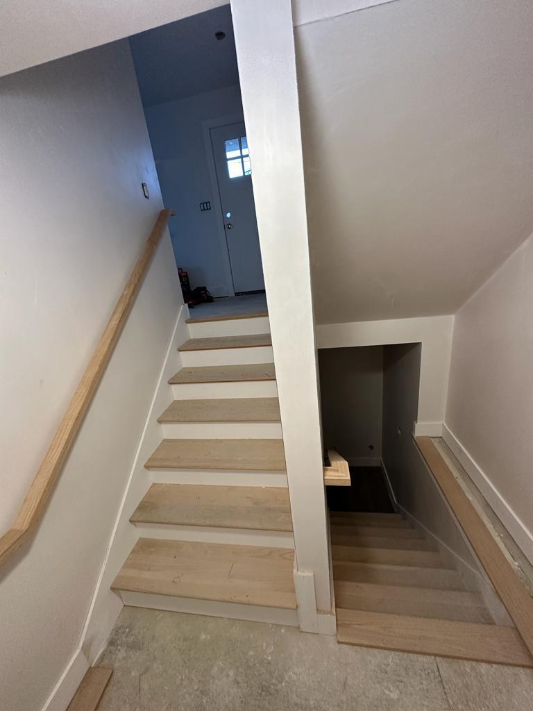 This project features a clean and modern wooden staircase that brings a minimalist feel to the home. With light-toned wood steps and a simple yet elegant handrail, this staircase offers a functional yet stylish transition between floors. The natural finish keeps it timeless while blending seamlessly with various interior styles.